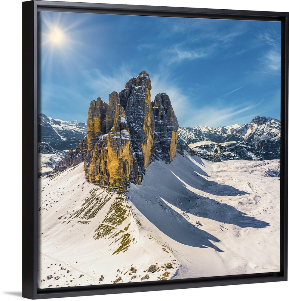 <p>Italy, Trentino-Alto Adige, Bolzano district, Alps, Dolomites, Alta Pusteria, Sesto, The sun illuminates the Tre Cime di Lavaredo (Drei Zinnen) casting shadows in the snow, in the winter in the afternoon.</p>