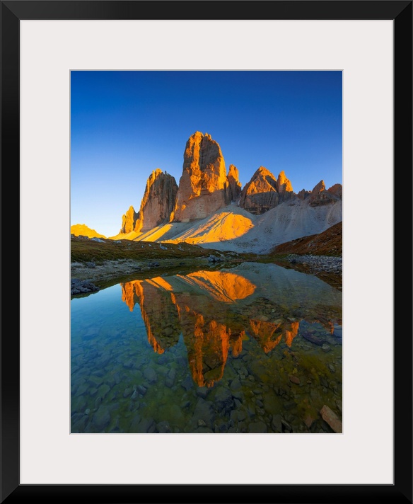 <p>Italy, Trentino-Alto Adige, Alps, Dolomites, Bolzano district, South Tyrol, Alta Pusteria, Dolomiti di Sesto Natural Park, Tre Cime di Lavaredo (Drei Zinnen) and Grava Longa lakes, evening.</p>