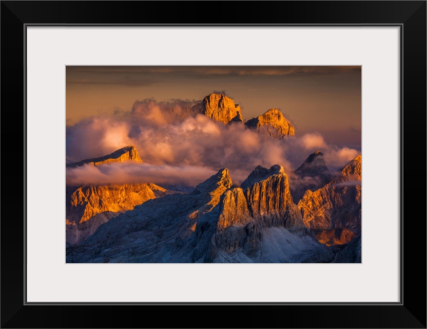 <p>Italy, Veneto, Alps, Dolomites, Belluno district, Cadore, Cortina d'Ampezzo, View from Lagazuoi refuge, Averau, Pelmo and Lastoi de Formin mountains at sunset</p>