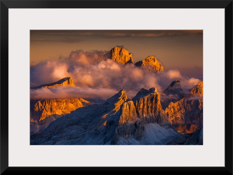 <p>Italy, Veneto, Alps, Dolomites, Belluno district, Cadore, Cortina d'Ampezzo, View from Lagazuoi refuge, Averau, Pelmo and Lastoi de Formin mountains at sunset</p>