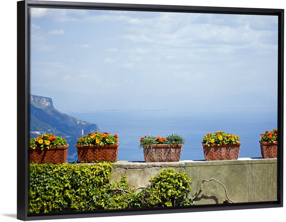 <p>Landscape, large photograph of numerous, rectangle flower pots with flowers, sitting on stone wall overlooking a hazy sky above the Amalfi Coast in Ravello, Italy.</p>
