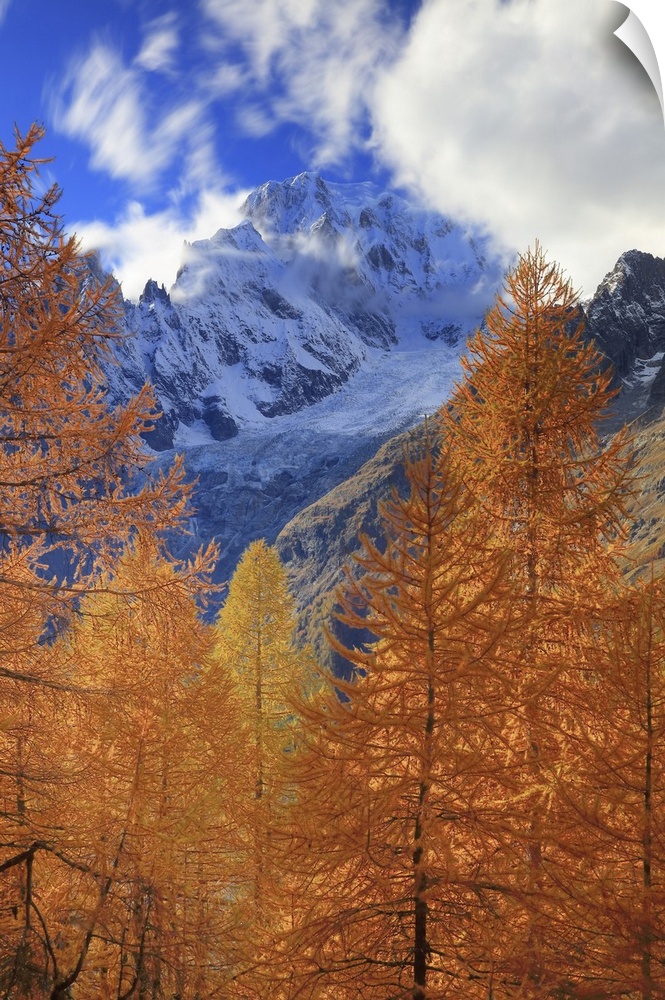 <p>Italy, Aosta Valley, Aosta district, Courmayeur, Val Ferret, Alps, Mont Blanc Mountain (4810m), Autumn larches in the area of Rifugio Bertone, with Mont Blanc in the background.</p>