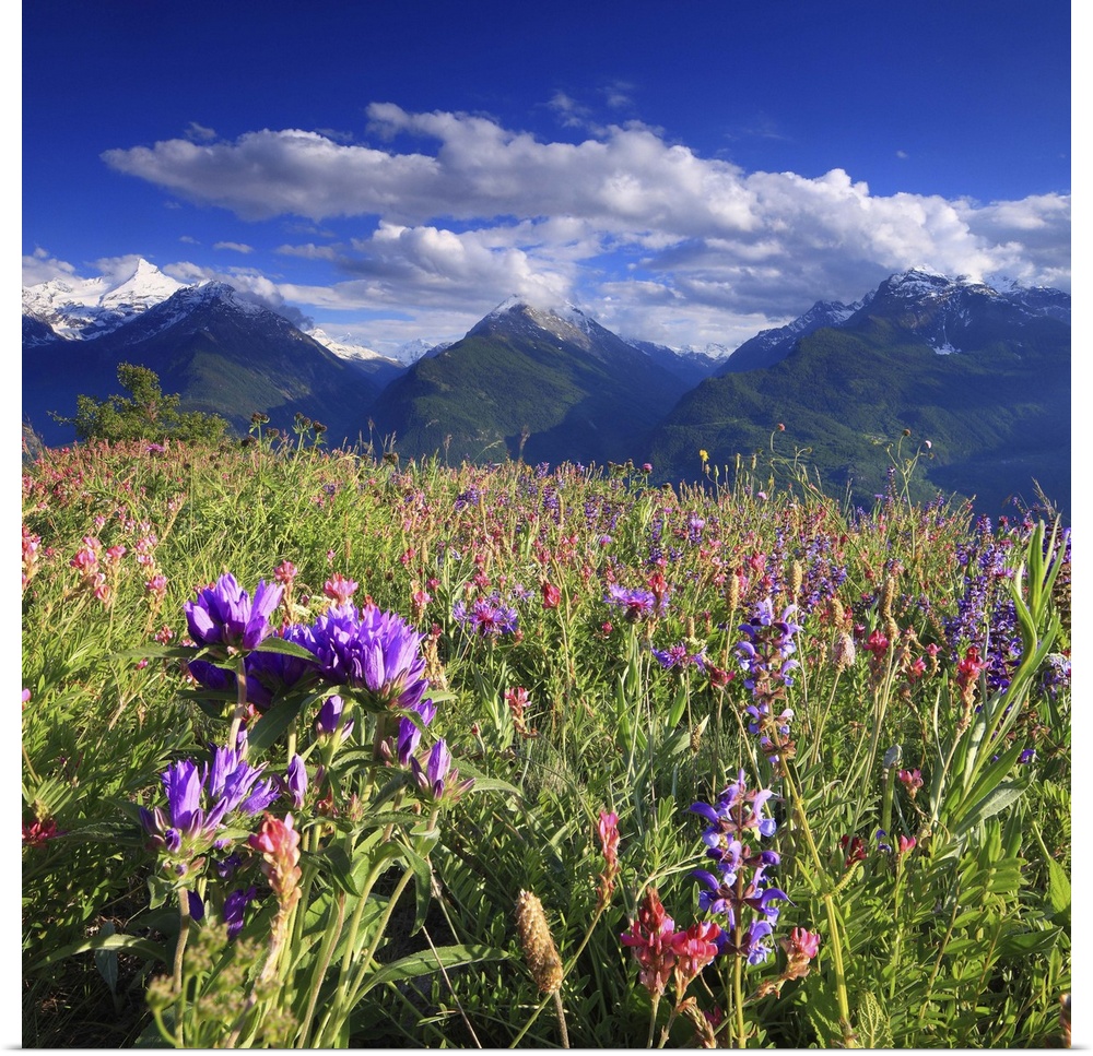<p>Italy, Aosta Valley, Mediterranean area, Alps, Aosta district, Flowering near V..tan (hamlet of Saint-Pierre), with (left to right) the Grivola (m 3969), the Valsavarenche and the Val di Rh..mes in the background</p>