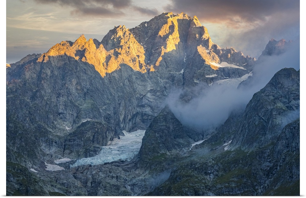 <p>Italy, Aosta Valley, Aosta district, Courmayeur, Val Ferret, Alps, Mont Blanc Mountain (4810m), Monte Bianco di Courmayeur in the Mont-Blanc Group at dawn.</p>