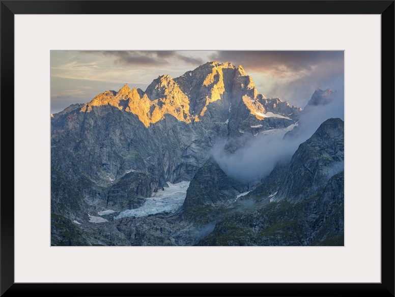 <p>Italy, Aosta Valley, Aosta district, Courmayeur, Val Ferret, Alps, Mont Blanc Mountain (4810m), Monte Bianco di Courmayeur in the Mont-Blanc Group at dawn.</p>