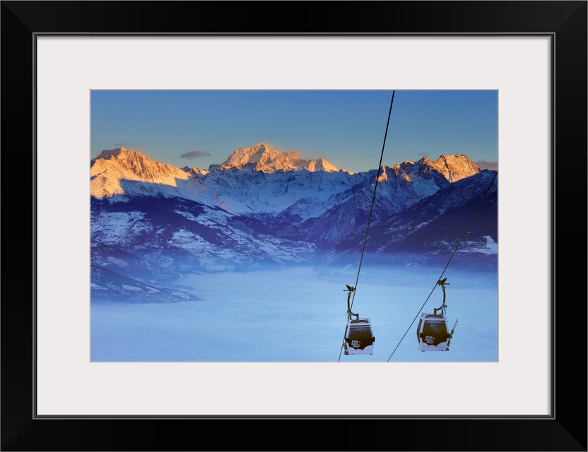 <p>Italy, Aosta Valley, Aosta district, Pila, Alps, The Aosta-Pila cablecar with the Grand Combin (m. 4.314, in the middle) at dawn in the background, low clouds cover the city of Aosta.</p>