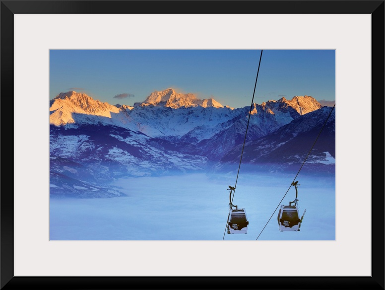 <p>Italy, Aosta Valley, Aosta district, Pila, Alps, The Aosta-Pila cablecar with the Grand Combin (m. 4.314, in the middle) at dawn in the background, low clouds cover the city of Aosta.</p>