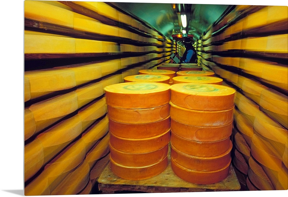 <p>Italy, Italia, Aosta Valley, Valle d'Aosta, Valpelline, Frissonia locality, store of fontina cheese located in a former copper mine</p>