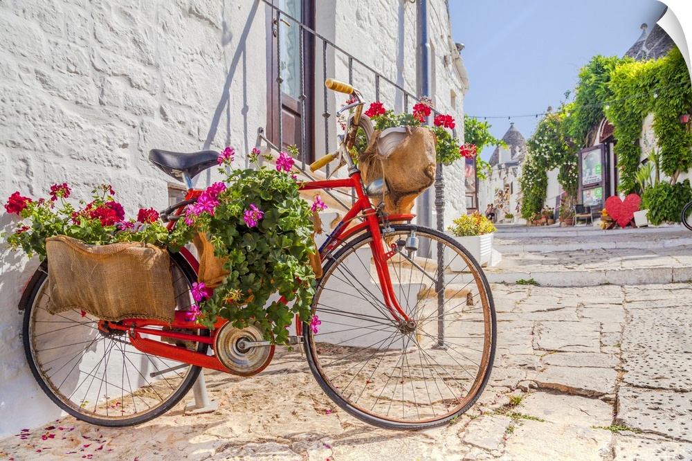 <p>Italy, Apulia, Bari district, Itria Valley, Alberobello, Bicycle in a typical street of Alberobello.</p>