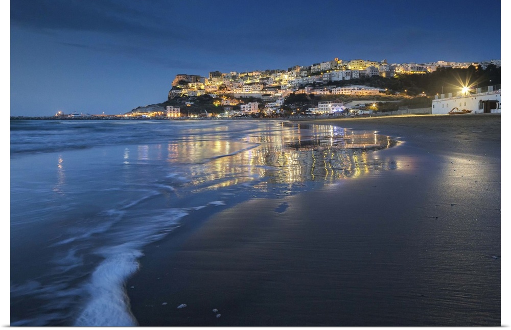 <p>Italy, Apulia, Mediterranean sea, Adriatic sea, Adriatic Coast, Foggia district, Gargano, Peschici, Gulf of Peschici at dusk.</p>