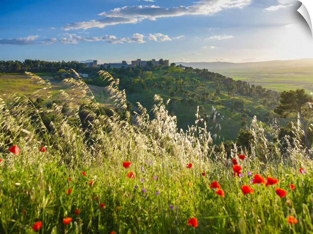<p>Italy, Apulia, Foggia district, Lucera, View towards the castle from the promenade of the park of the Villa Comunale at sunset.</p>