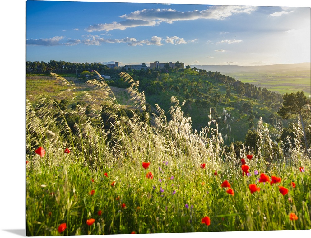 <p>Italy, Apulia, Foggia district, Lucera, View towards the castle from the promenade of the park of the Villa Comunale at sunset.</p>