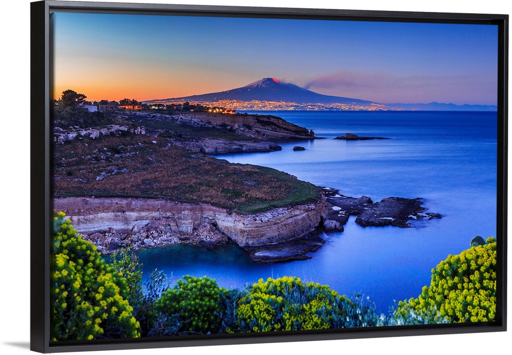 <p>Italy, Sicily, Mediterranean sea, Siracusa district, Augusta, Capo Santa Croce Bay with Catania and Mount Etna erupting in the background.</p>