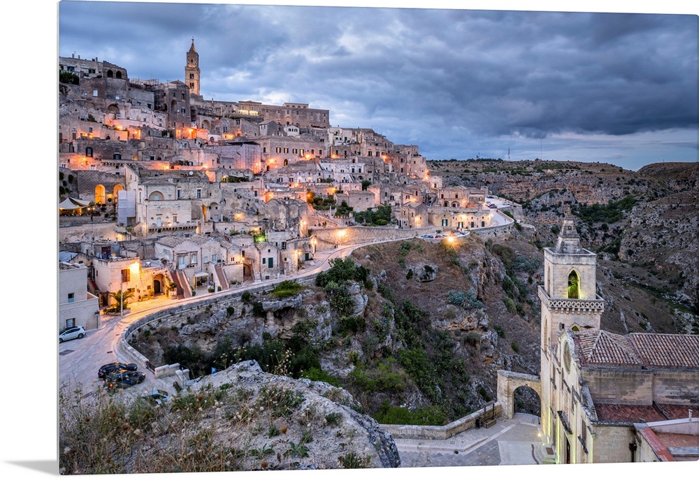 <p>Italy, Basilicata, Matera, Sasso Barisano view from Sasso Caveoso and, in the foreground, the popularly known as the church of San Pietro Caveoso in the evening, European Capital of Culture 2019.</p>