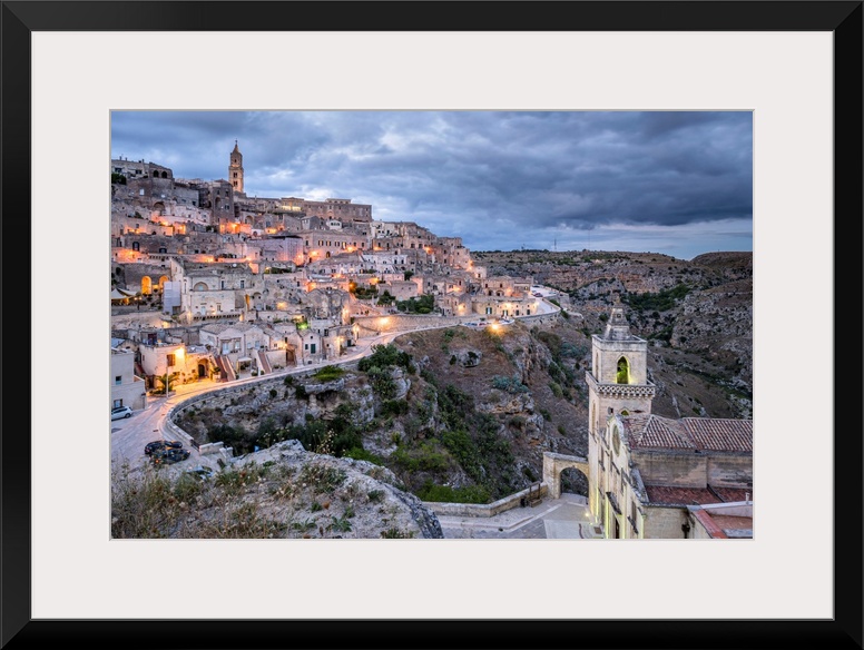 <p>Italy, Basilicata, Matera, Sasso Barisano view from Sasso Caveoso and, in the foreground, the popularly known as the church of San Pietro Caveoso in the evening, European Capital of Culture 2019.</p>