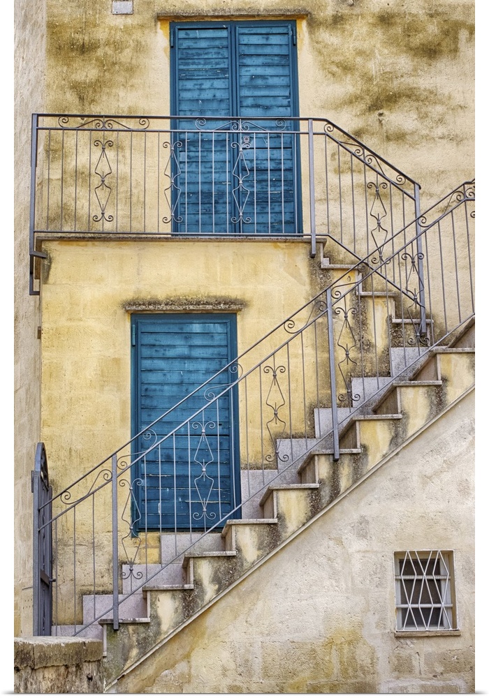 <p>Italy, Basilicata, Matera. Stairs leading to blue doors and shutters in old town Matera.</p>