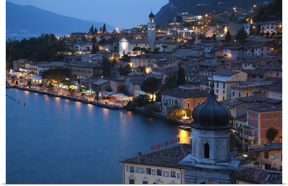 <p>ITALY, Brescia Province, Limone sul Garda. Aerial town view, dusk.</p>