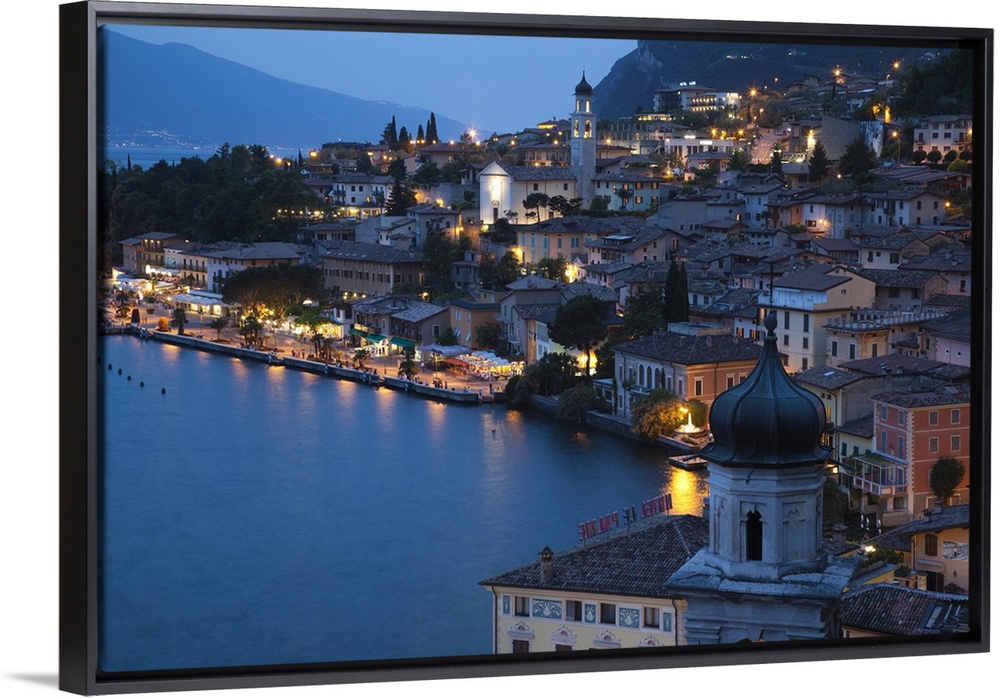<p>ITALY, Brescia Province, Limone sul Garda. Aerial town view, dusk.</p>