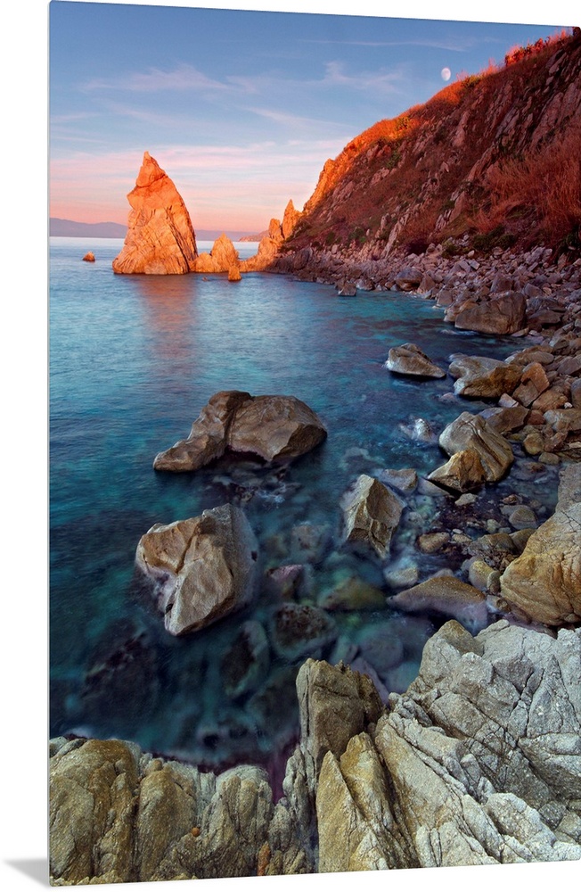 <p>Italy, Calabria, Mediterranean sea, Vibo Valentia district, Parghelia, Pizzuta Rock at sunset, Parghelia.</p>