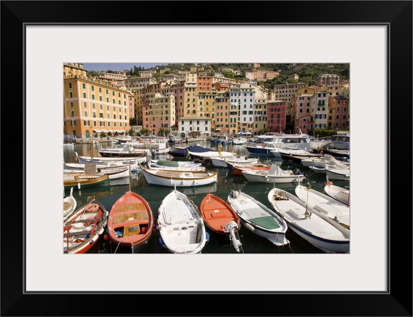 <p>Europe, Italy, Camogli. Boats moored in harbor with colorful town buildings in background.</p>