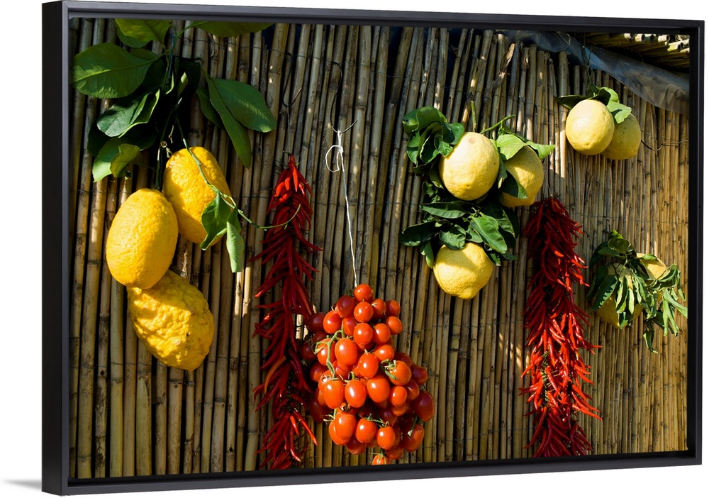 <p>Italy, Campania, Amalfi Coast, Salerno district, Peninsula of Sorrento, Amalfi, Lemons, tomatoes and red chilies, typical products of Campania, Sorrento and the Amalfi Coast.</p>