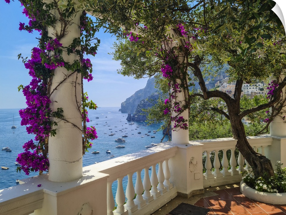 <p>Italy, Campania, Salerno district, Peninsula of Sorrento, Positano, Amalfi Coast, Mediterranean sea, Tyrrhenian coast, Bougainvillea in Positano and boats along the Amalfi coast.</p>