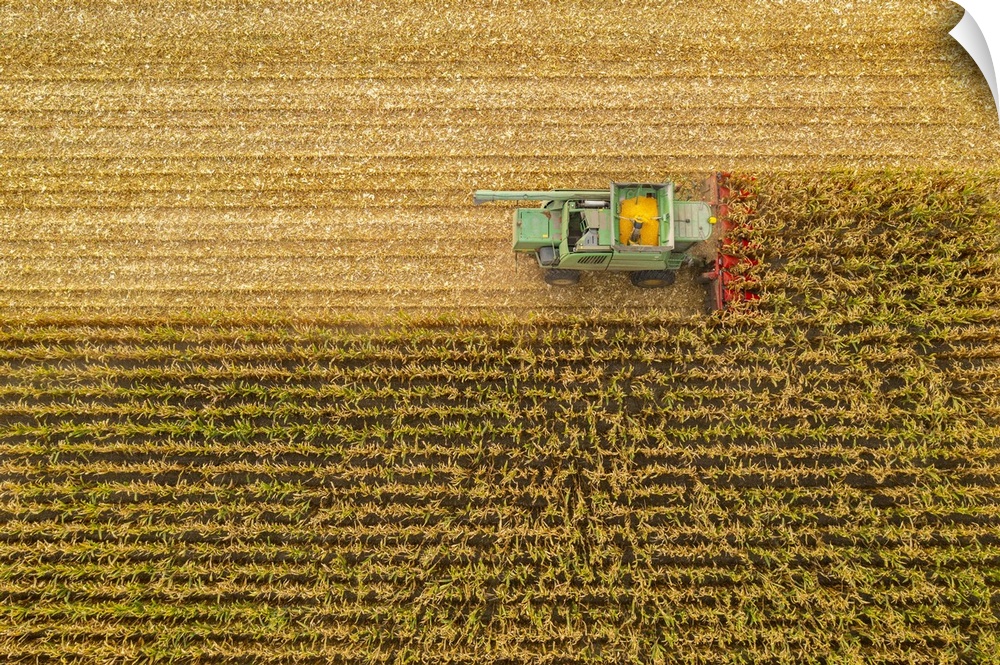 <p>Italy, Veneto, Venezia district, Caorle, Combine harvester on a wheat field with yellow crop in the basket.</p>