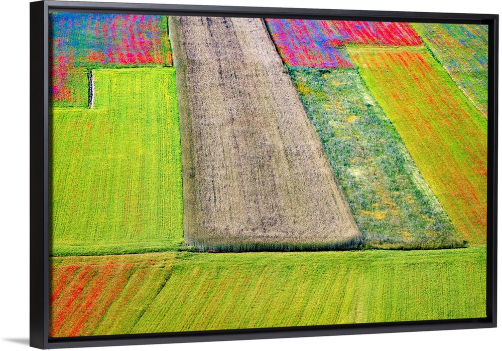 <p>Italy, Castelluccio. Aerial of field with flower patterns. Credit: Jim Nilsen</p>