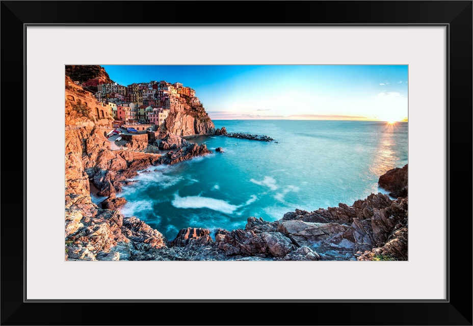 <p>Italy, Liguria, La Spezia district, Mediterranean sea, Ligurian sea, Ligurian Riviera, Parco Nazionale delle Cinque Terre, Riviera di Levante, Cinque Terre, Manarola with its typical pastel-color houses painted by the warm light of the sunset.</p>
