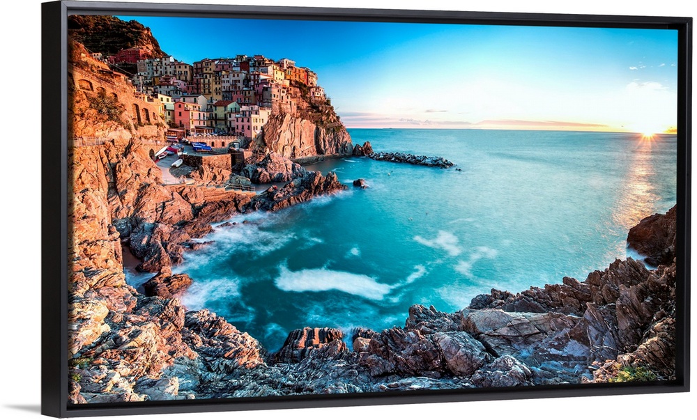 <p>Italy, Liguria, La Spezia district, Mediterranean sea, Ligurian sea, Ligurian Riviera, Parco Nazionale delle Cinque Terre, Riviera di Levante, Cinque Terre, Manarola with its typical pastel-color houses painted by the warm light of the sunset.</p>