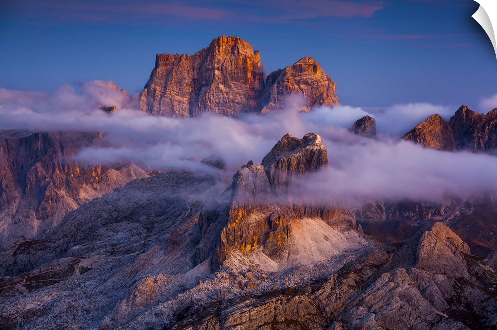 <p>Italy, Veneto, Cortina d'Ampezzo, View from Lagazuoi refuge, Averau and Pelmo mountains at sunset.</p>