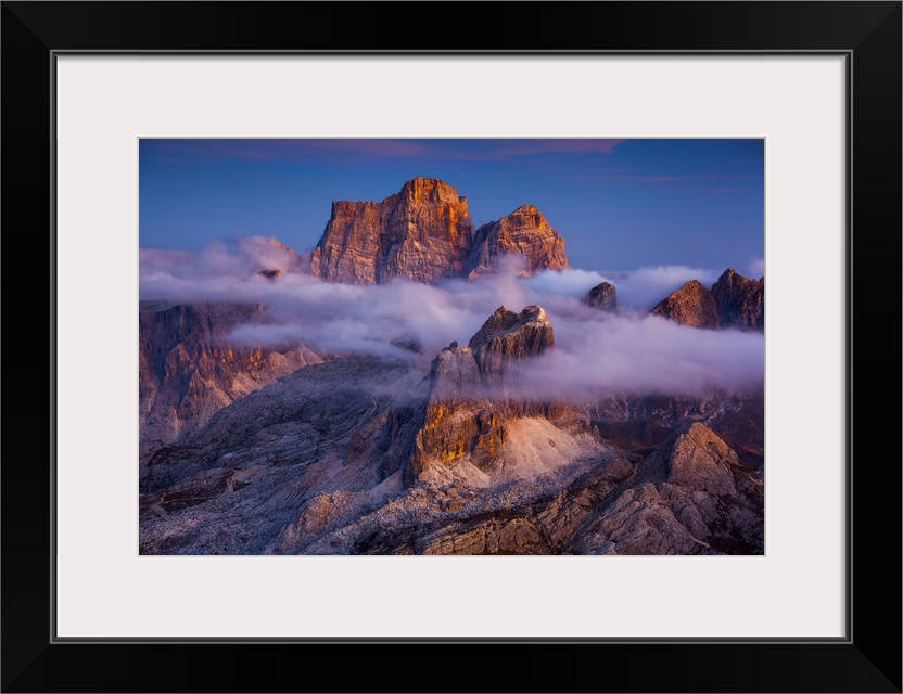 <p>Italy, Veneto, Cortina d'Ampezzo, View from Lagazuoi refuge, Averau and Pelmo mountains at sunset.</p>