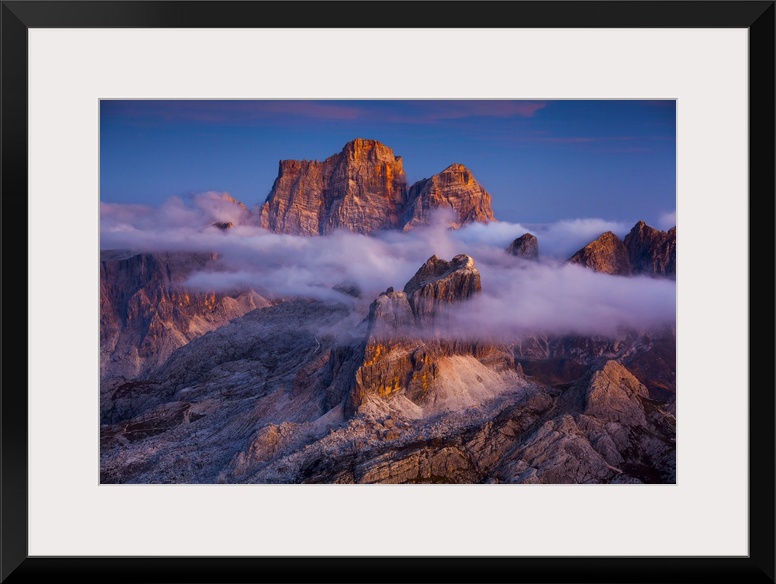 <p>Italy, Veneto, Cortina d'Ampezzo, View from Lagazuoi refuge, Averau and Pelmo mountains at sunset.</p>