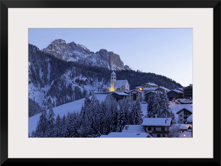 <p>Italy, Veneto, Belluno district, Alps, Dolomites, Alto Agordino, Colle Santa Lucia, Church of Santa Lucia and Monte Civetta in the evening.</p>
