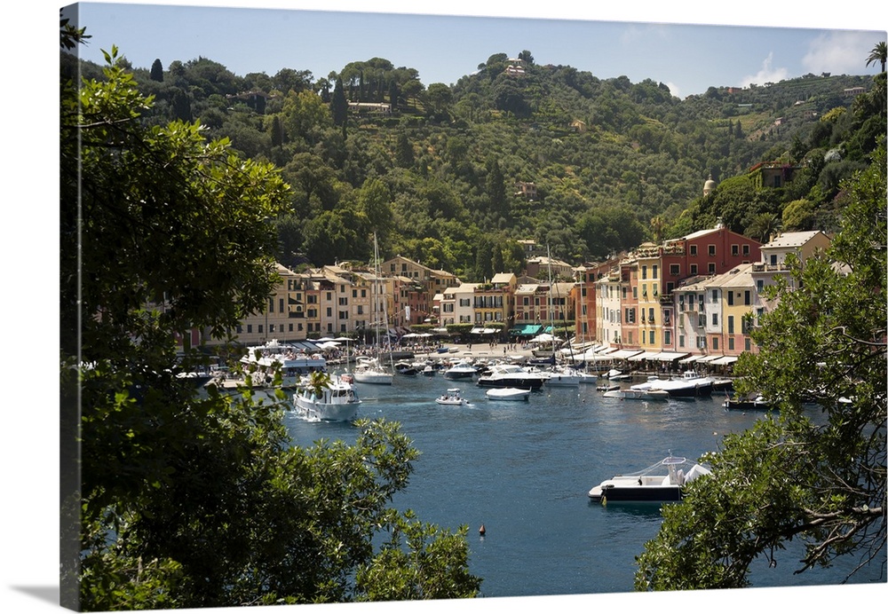<p>Italy, Genoa province, Portofino. Upscale fishing village on the Ligurian Sea, pastel buildings overlooking harbor</p>
