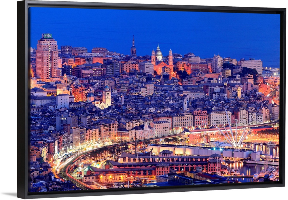 <p>Italy, Liguria, Ligurian sea, Ligurian Riviera, Genova district, Genova, Genoa, Harbor and the town illuminated at dusk.</p>