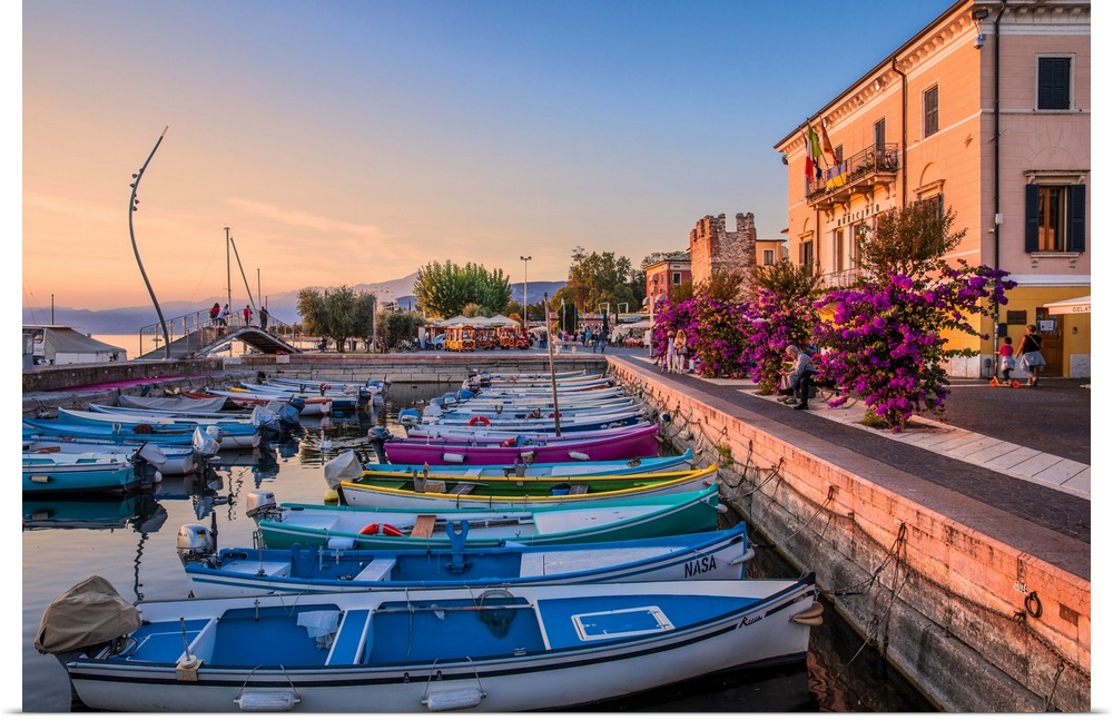 <p>Italy, Veneto, Verona district, Lake Garda, Bardolino, Marina, Medieval Tower and Albergo Catullo along the lakefront of Bardolino.</p>