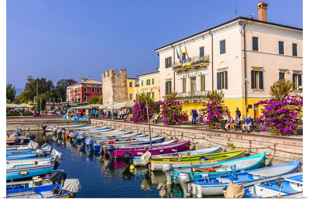<p>Italy, Veneto, Verona district, Lake Garda, Bardolino, Marina, Medieval Tower and Albergo Catullo along the lakefront of Bardolino.</p>