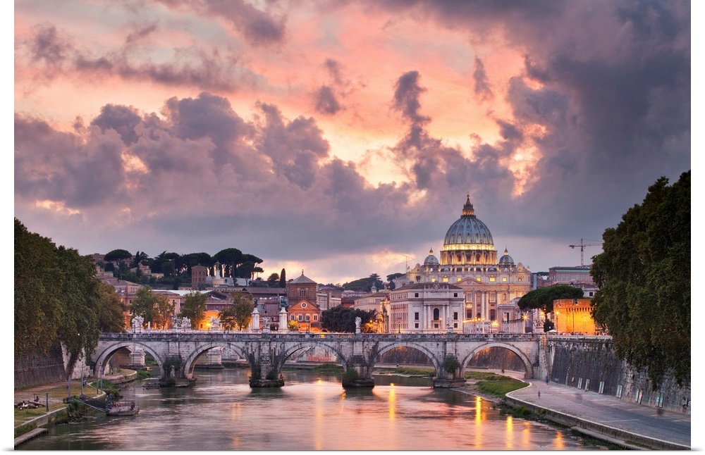 <p>Italy, Latium, Tiber, Tevere, Roma district, Rome, Saint Peter's Basilica, Sunset over Saint Peter's Basilica and the Tiber river.</p>
