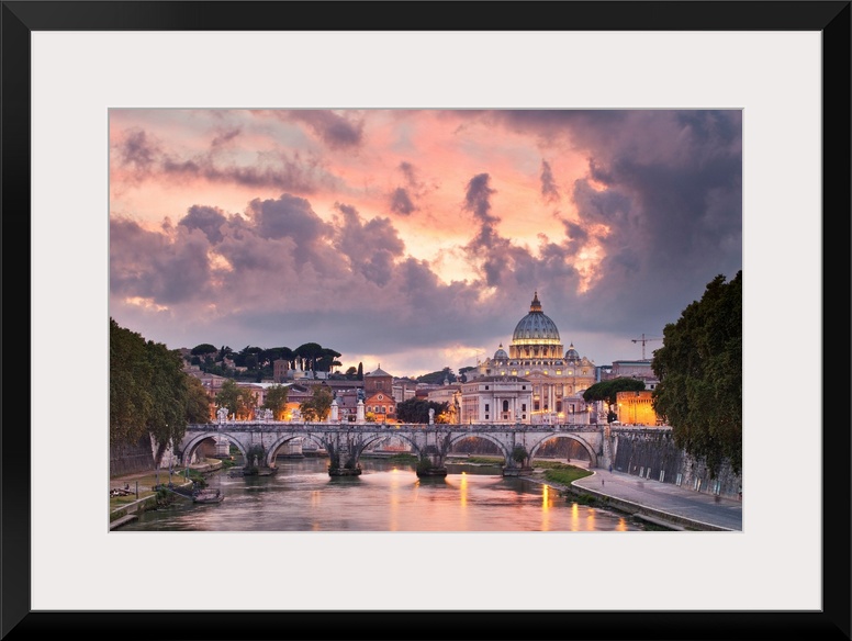 <p>Italy, Latium, Tiber, Tevere, Roma district, Rome, Saint Peter's Basilica, Sunset over Saint Peter's Basilica and the Tiber river.</p>