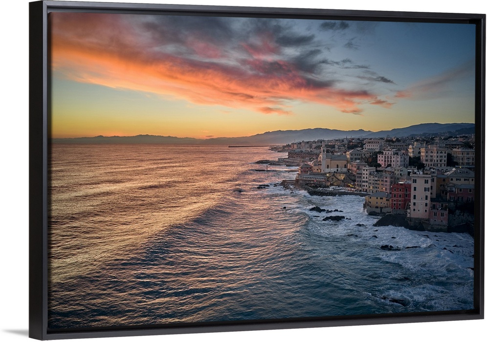 <p>Italy, Liguria, Genova district, Mediterranean sea, Ligurian sea, Ligurian Riviera, Genova, Aerial view of Boccadasse at sunset during a storm.</p>