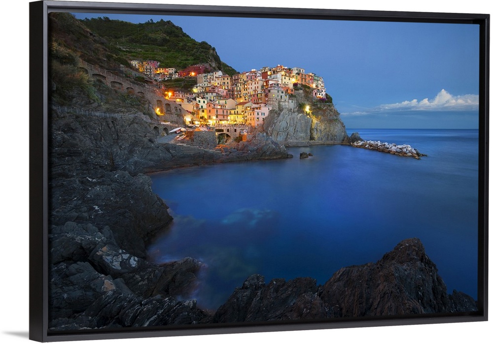 <p>Italy, Liguria, Ligurian sea, Ligurian Riviera, Parco Nazionale delle Cinque Terre, La Spezia district, Riviera di Levante, Cinque Terre, Manarola at dusk.</p>