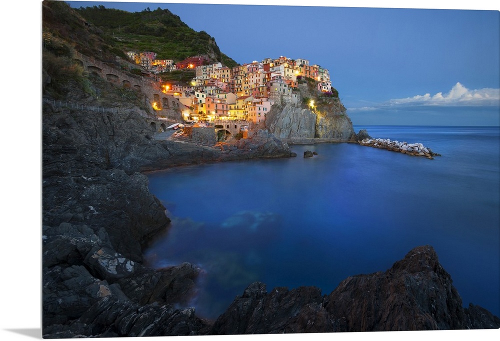 <p>Italy, Liguria, Ligurian sea, Ligurian Riviera, Parco Nazionale delle Cinque Terre, La Spezia district, Riviera di Levante, Cinque Terre, Manarola at dusk.</p>