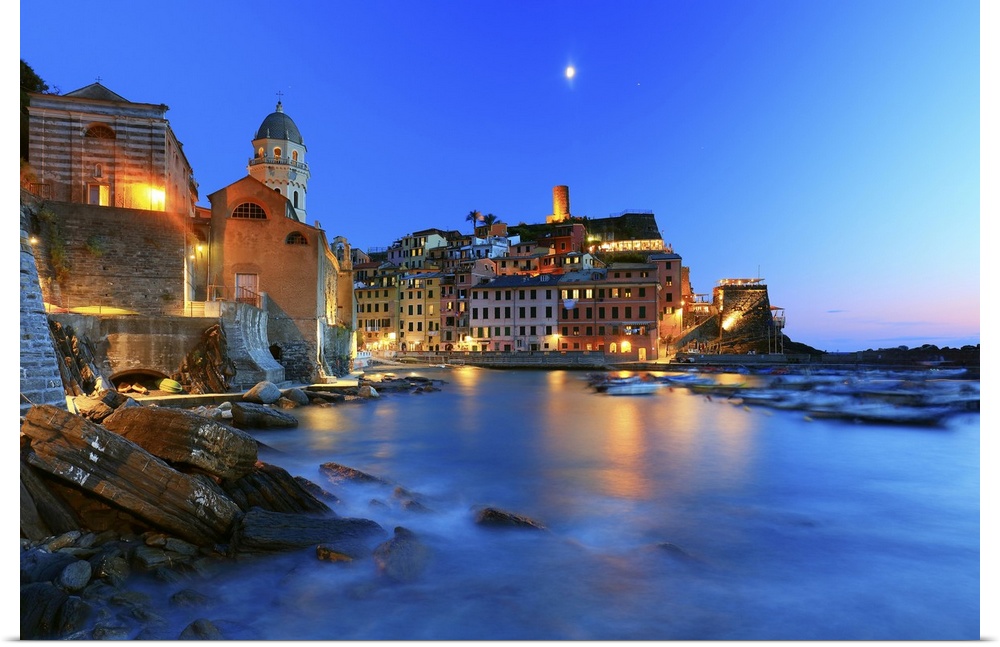<p>Italy, Liguria, La Spezia district, Mediterranean sea, Ligurian sea, Ligurian Riviera, Parco Nazionale delle Cinque Terre, Riviera di Levante, Cinque Terre, The Vernazza village in the evening lights.</p>