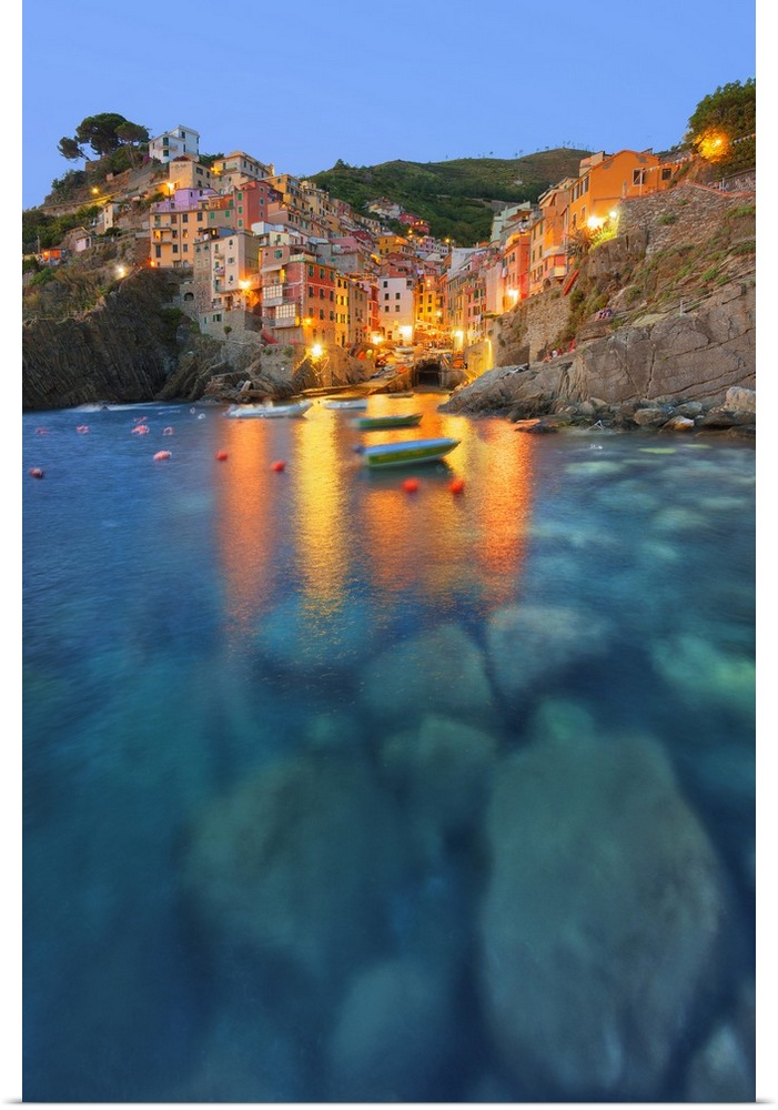 <p>Italy, Liguria, Ligurian sea, Ligurian Riviera, Parco Nazionale delle Cinque Terre, La Spezia district, Riviera di Levante, Cinque Terre, Riomaggiore at dusk.</p>