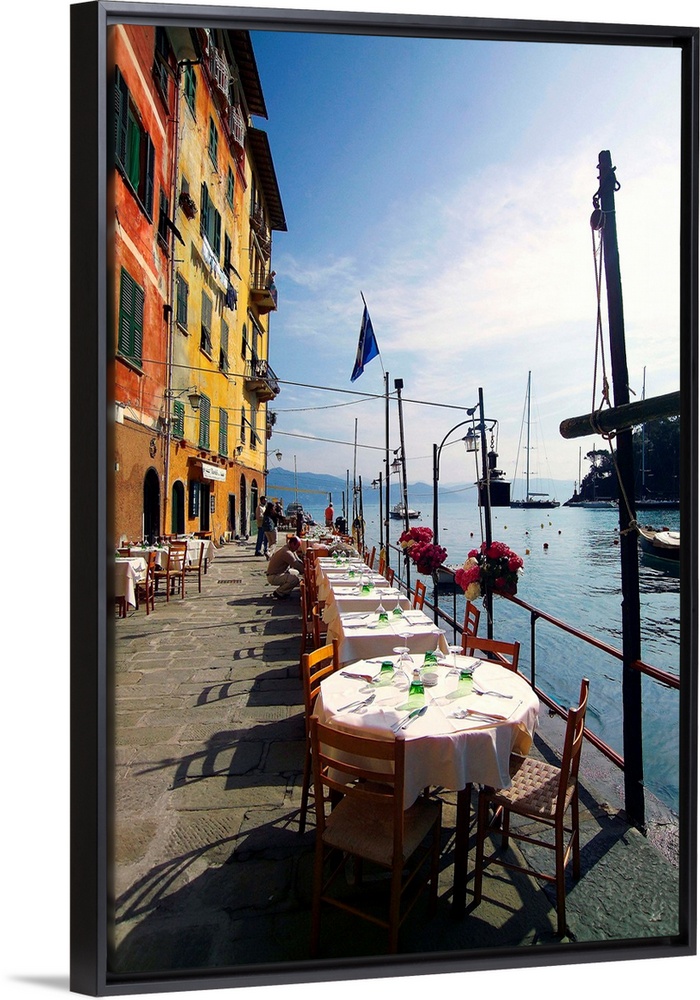 <p>Italy, Liguria, Portofino, Tables along the harbor side.</p>