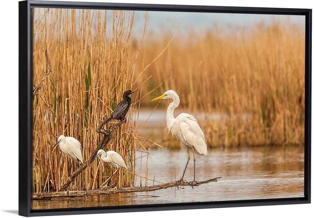 <p>Italy, Friuli-Venezia Giulia, Udine district, Little Egret, Great Egret and Cormorant at Caneo Oasis on Cona Island.</p>