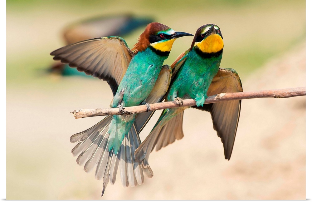 <p>Italy, Lombardy, Mantova district, Canneto sull'oglio, Couple of bee-eaters on a branch laid.</p>