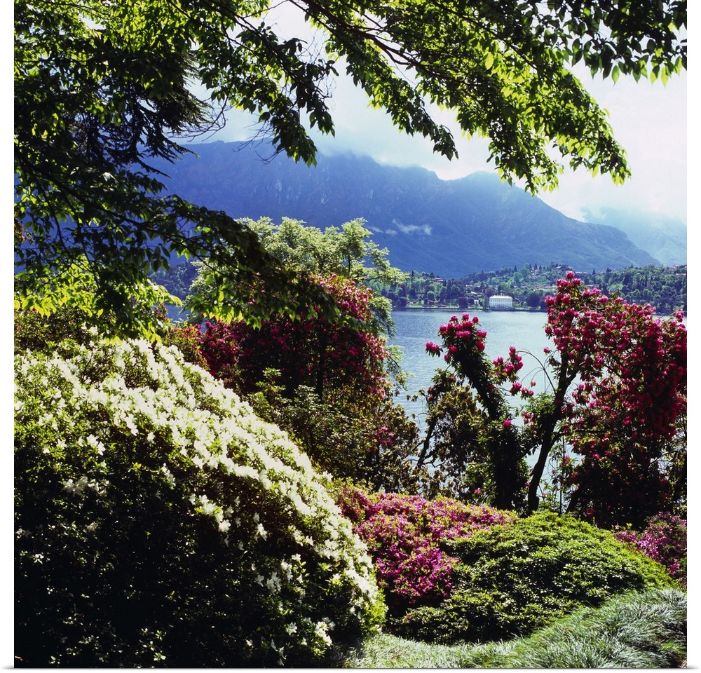 <p>Italy, Lombardy, Como Lake, Tremezzo, Mediterranean area, Como district, Travel Destination, Villa Carlotta,park and rhododendron,view over the lake to Villa Melzi</p>