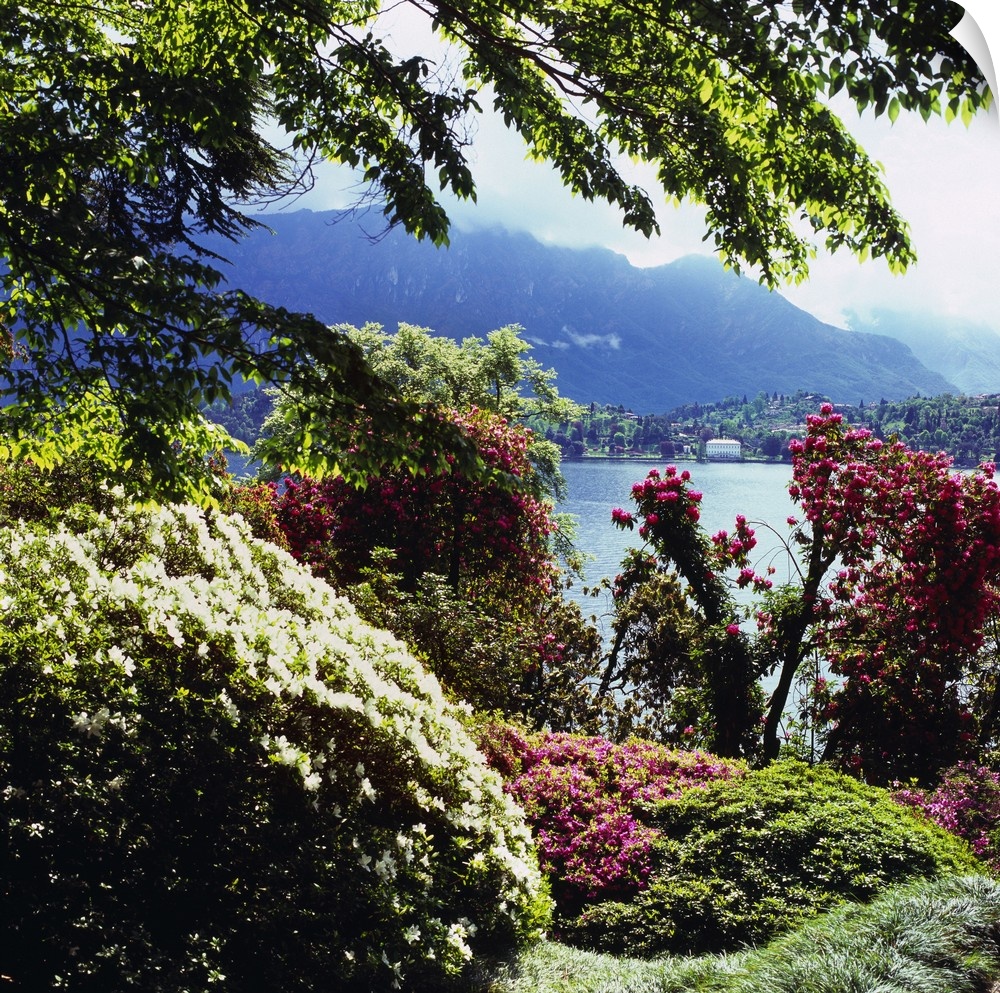 <p>Italy, Lombardy, Como Lake, Tremezzo, Mediterranean area, Como district, Travel Destination, Villa Carlotta,park and rhododendron,view over the lake to Villa Melzi</p>